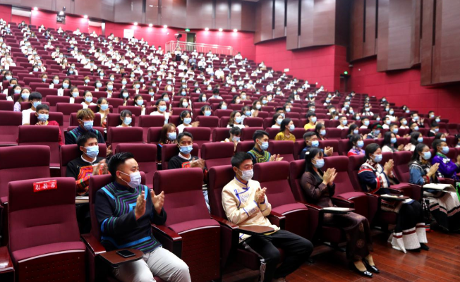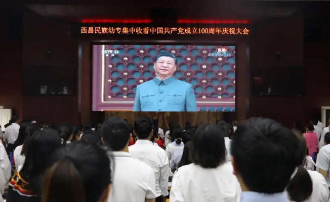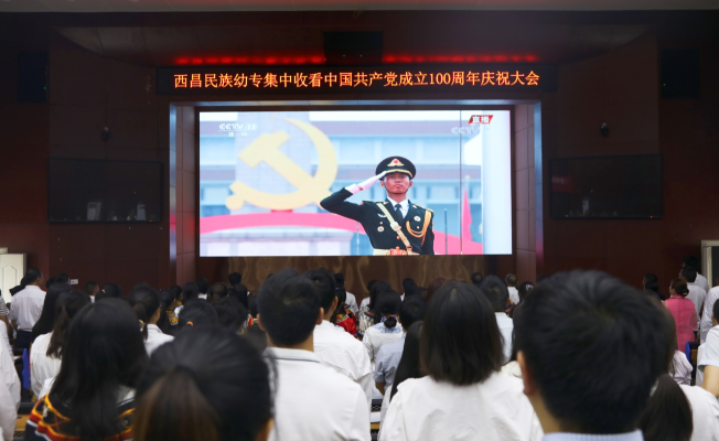 7月1日上午8时,西昌民族幼专全体师生齐聚在学术报告B厅、第1教学楼、第3教学楼、第4教学楼、第5教学楼、第6教学楼、第7教学楼,集中收看中国 共产党成立100周年庆祝大会实况直播