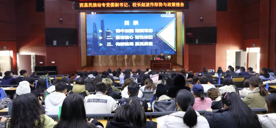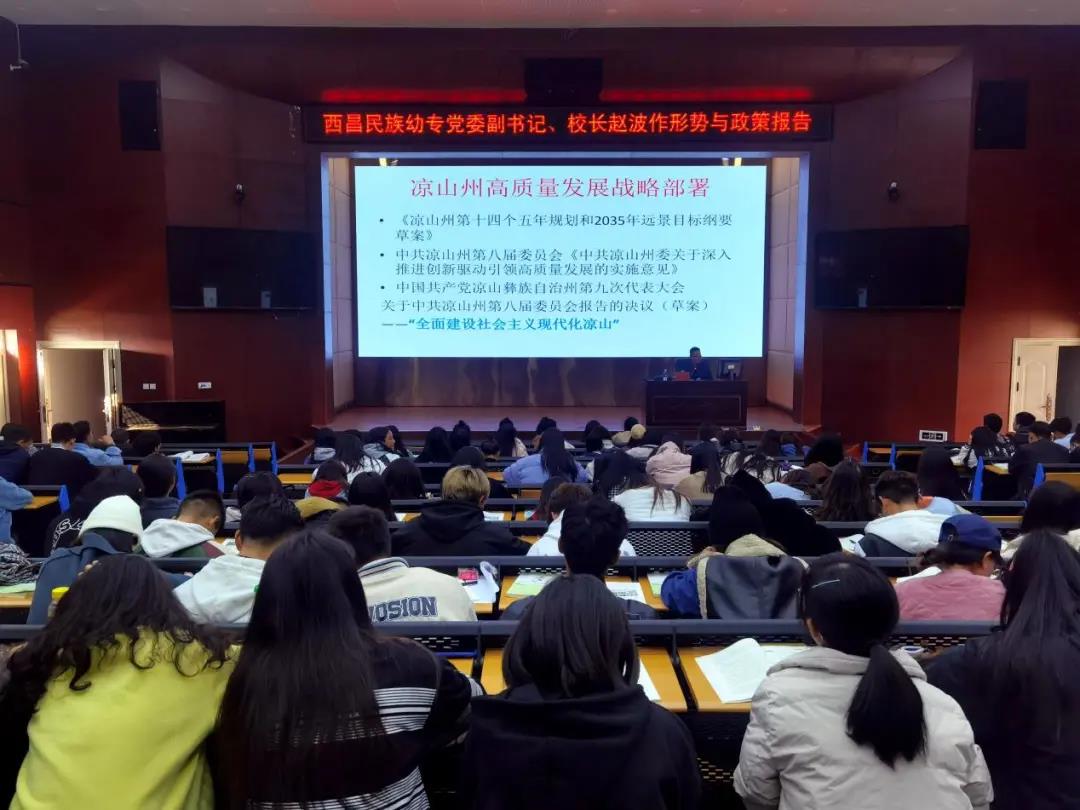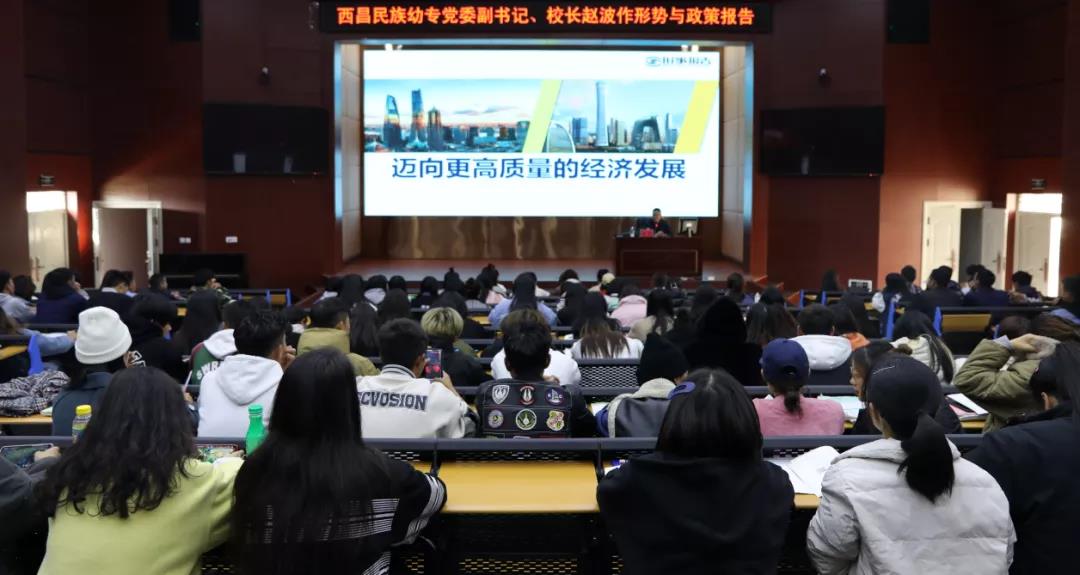 最后,赵波校长结合凉山州的实际情况,向同学们介绍了凉山州高质量发展的战略部署,强调必须把推动高质量发展作为第一要务,在加快发展中赢得主动、赢得未来,并鼓励同学们要坚定国家向好发展的信心、坚定凉山州高质量发展的信心。