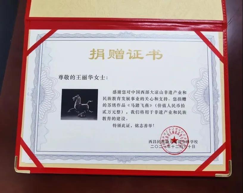 收到作品捐赠后,学校特意为王丽华授予捐赠证书致以谢意,感谢她对西部大凉山非遗产业和民族教育发展事业的关心及支持,希望常来凉山和学校指导、做客。