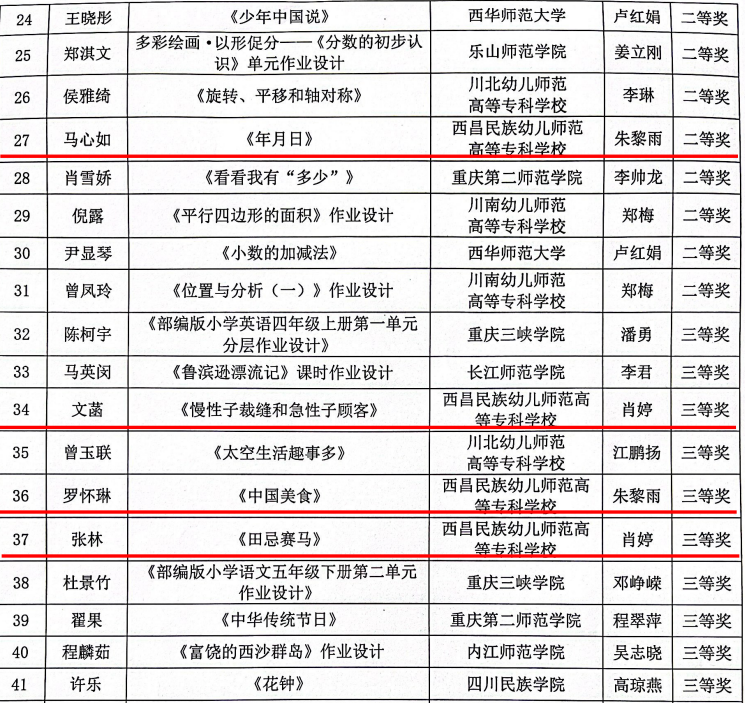 在“双减”政策背景下,为充分发挥作业育人功能,增强小学教育师范生职业技能,小学教育系10名学生积极参加了成渝地区小学教育联盟首届小学作业设计大赛。据悉,全省共有170名参赛选手进入决赛,经过层层评选,高校组最终有51位同学获奖,其中,我校小学教育系有6位同学取得佳绩。