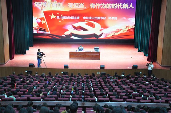 2019年4月24日上午9时,西昌民族幼儿师范高等专科学校、凉山民族师范学校在雏鹰剧场举行了形势报告会,四川省政协副主席、凉山州委书记林书成作了以《培养有信仰、有担当、有作为的时代新人》为题的形势报告。报告深刻诠释了坚定“四个自信”的理论逻辑、阐释了“五彩凉山”拥有光明前景的实践逻辑、剖析了西昌民族幼专把准办学定位的发展逻辑,体现了高度的思想性、政治性、指导性和针对性。凉山州委办公室副主任石兴普、凉山州教育体育局副局长李良彬参加了报告会。