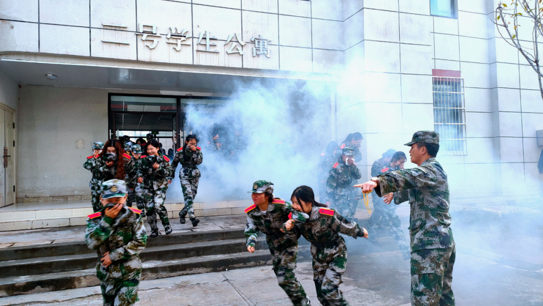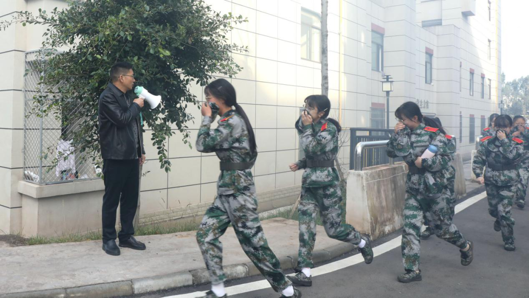 沙德康下达指令后,1号、2号和3号学生公寓楼同时点燃烟球,参训教官立即对学生进行安全疏散,辅导员和相关工作人员在各路口对学生进行疏散引导。
