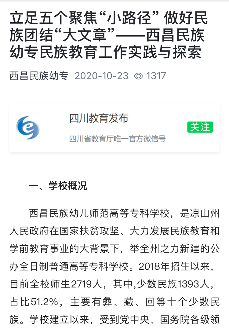 “四川教育发布”平台发布学校重要文章“立足五个聚焦“小路径” 做好民族团结'大文章'——西昌民族幼专民族教育工作实践与探索”,学校是在国家扶贫攻坚、大力发展民族教育和学前教育事业大背景下,举全凉山州之力新建的一所公办全日制普通高等专科学校。始终以“服务基础教育,服务乡村振兴,服务民族地区,培养优秀师资和技术技能型人才”为己任,立足凉山州,面向攀西经济区,辐射川渝滇黔周边民族地区,致力于将学校建成民族特色鲜明的高水平幼儿师范高等专科学校。着力为四川乃至西南民族地区培养“下得去、用得上、干得好、留得住、有发展”的幼儿教师、小学教师和技术技能人才。围绕立德树人的根本任务,从聚焦制度建设,建立民族团结进步运行机制、聚焦民族特色,建设民族团结进步校园环境、聚焦宣传阵地,营造民族团结进步良好氛围、聚焦活动载体,形式民族团结进步特色活动、聚焦对口支援,促进民族团结进步全面发展等方面不断进行实践探索,取得一定工作成效。