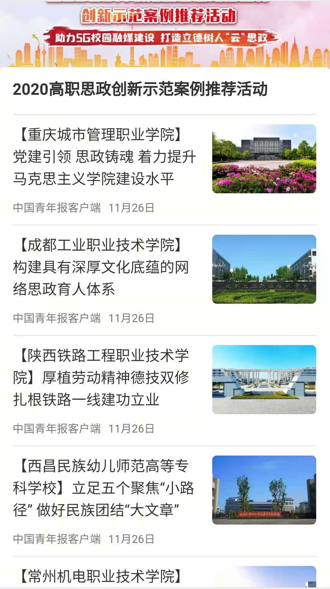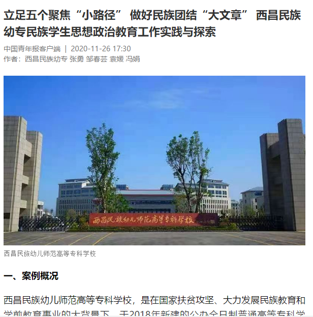 11月26日中国青年报全面宣传报道了宣传统战部张勇、邹春芸、袁媛、冯娟撰写的《立足五个聚焦“小路径” 做好民族团结“大文章”——西昌民族幼专民族学生思想政治教育工作实践与探索》,该案例已正式入围了2020年全国高职思政创新示范案例,正在中国青年报、中青在线宣传展示。