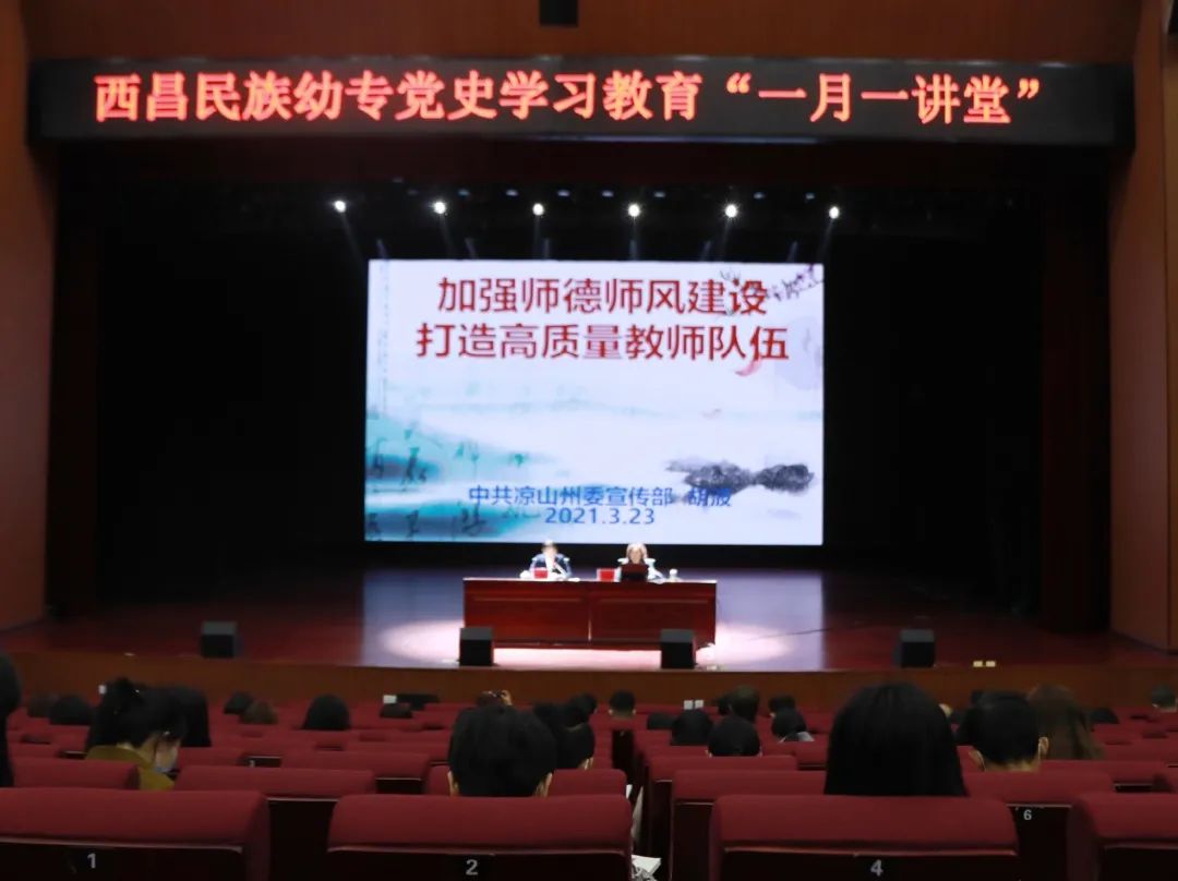 为引导广大党员干部和师生深刻感悟党的创新理论的真理力量、实践力量、人格力量和思想伟力,学校创新开展党史学习教育“一月一讲堂”,以专家引导学。3月23日下午,学校邀请了凉山州委宣传部原副部长、二级巡视员、州委讲师团原团长、州委讲师团理论宣讲专家库成员胡波以“加强师德师风建设,打造高质量教师队伍”为主题的讲座在雏鹰剧院召开,全体在家校领导、全校教职工和部分学生代表听取了讲座,讲座现场由学校党委副书记王玉萍主持。