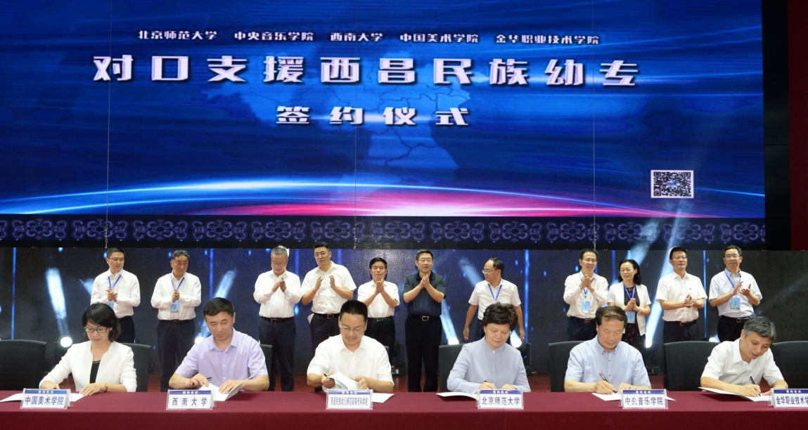 北京师范大学校长董奇,西南大学党委副书记潘洵,中央音乐学院党委书记赵旻,中国美术学院党委委员、宣传部长傅巧玲,金华职业技术学院校长梁克东,四川师范大学校长汪明义,电子科技大学副校长胡俊,西南石油大学党委书记孙一平,成都体育学院副校长胥万兵,西昌学院院长贺盛瑜,四川幼专纪委书记方波,川北幼专副校长王天银,分别与西昌民族幼儿师范高等专科学校赵波校长签订对口支援协议。与会领导和嘉宾观看了学校宣传片,欣赏了学校师生自编、自导、自演的“我爱中国•青春向上”主题教学成果展演,大家对我校师生表现出的较高艺术水平给予了肯定和赞赏,对演出作品所表现出的爱国精神、人文内涵、巧妙构思和价值追求等鲜明特征给予了一致认可和高度评价。