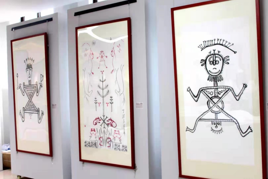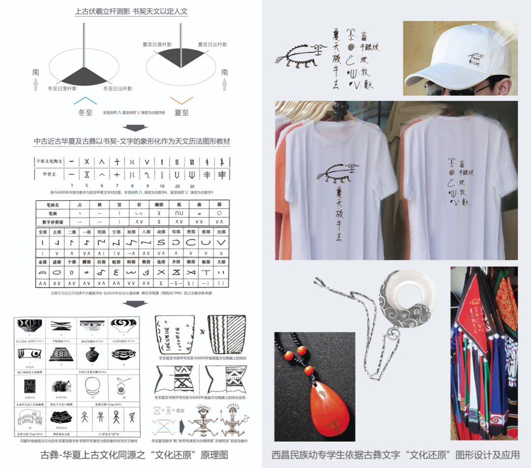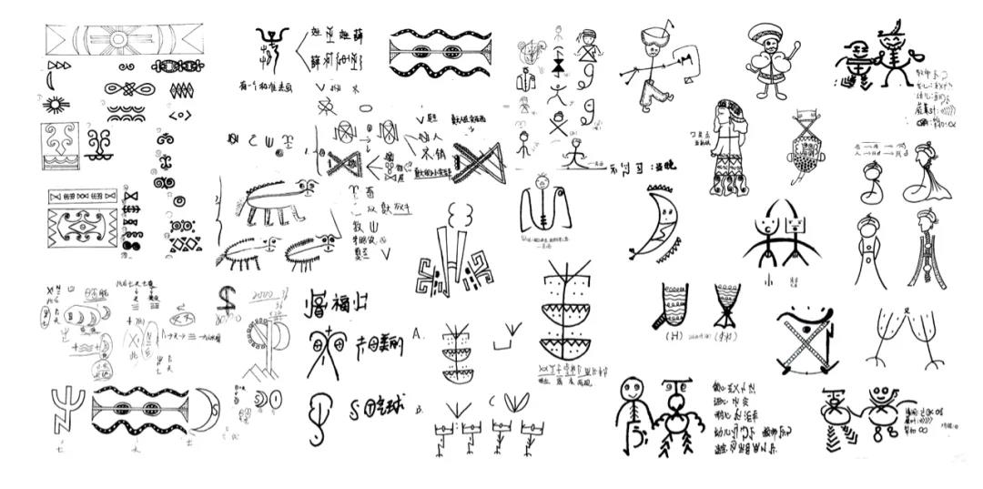在此次展出的作品中值得一提的是西昌民族幼专学生对彝族文化的“图形文创”。据悉,古彝文化与华夏上古文化同源,彝族太阳历、二进制数学、文字系统、平等观、祭祀仪礼文化、漆器、服装服饰、歌舞和玛牧文化、古彝建筑、毕摩文化等古彝的全套文化系列具有极大的研究和应用价值。学生采用古朴的单线图绘形式融入文字,记录了古彝的千年传说、历史、文化,这一文创作品融古朴奇谲与现代于一体的时尚感,是对古彝及华夏上古设计思路的传承和现代应用,在普通文创应用上,显示出强烈独特的艺术个性,具有较强的美育和文创开发价值。