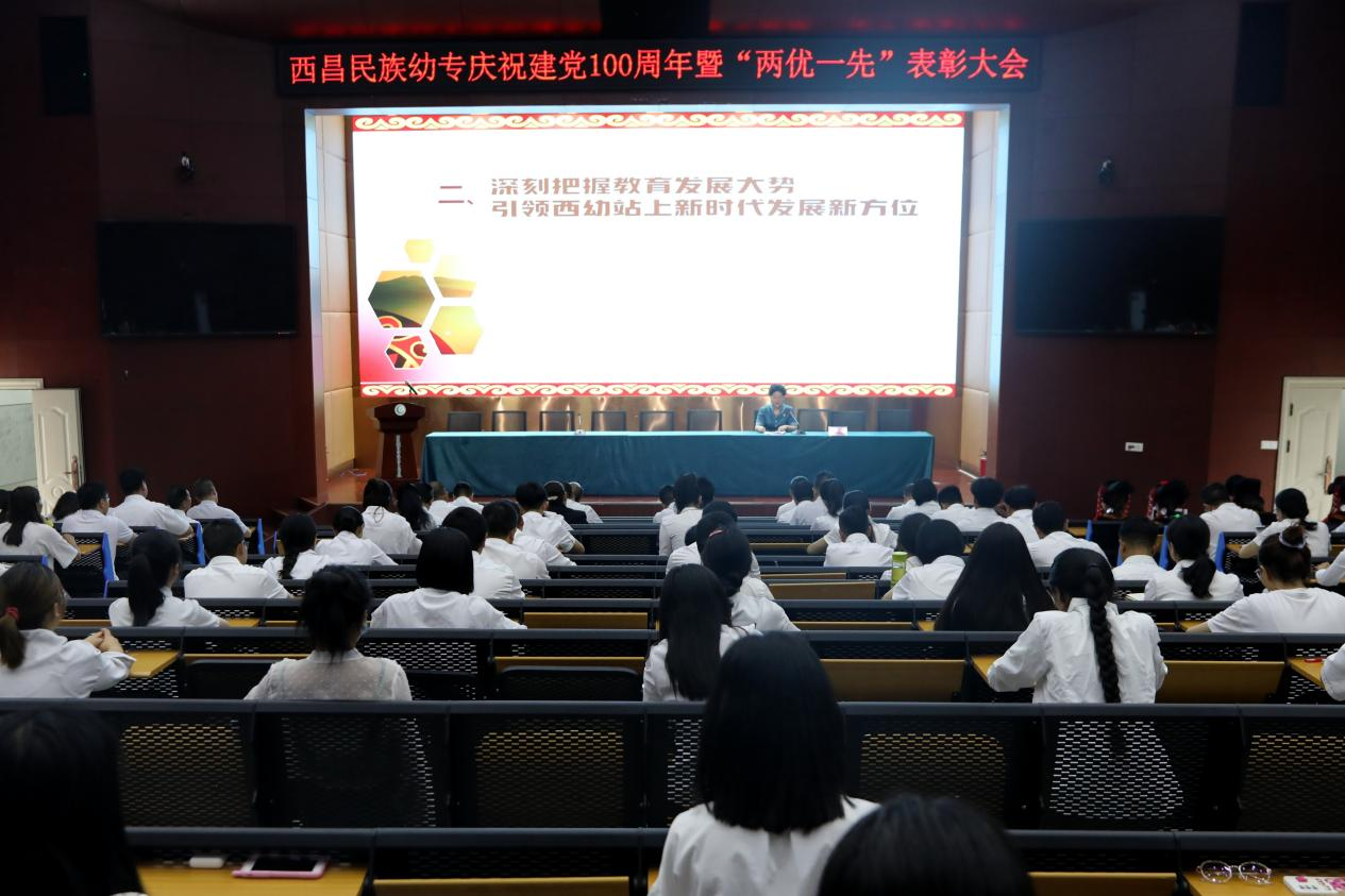 会上,石芳以《汲取奋进伟力,扛起使命担当——奋力谱写西幼发展新篇章》为题,从重温百年党史,坚定理想信念;把握教育发展大势,引领学校发展新方位;强化使命担当,推进学校工作新台阶三个方面深刻回答了中国 共产党为什么“能”、马克思主义为什么“行”、中国特色社会主义为什么“好”。她指出,学校自2018年3月创建以来,始终坚持党建引领,把党建工作与业务工作深入融合,保持发展良好势头,以高质量党建工作推动学校发展高质量。石芳勉励全体与会人员同心同德,扎实苦干,开拓创新,锐意进取,奋力谱写新时代西幼发展新篇章,为建设全国民族地区一流、特色先明的幼儿师范高等专科学校而努力奋斗!