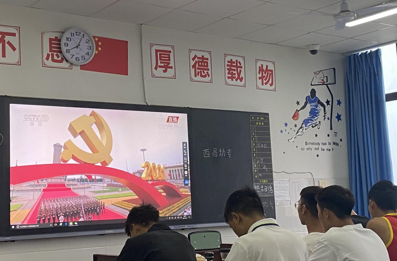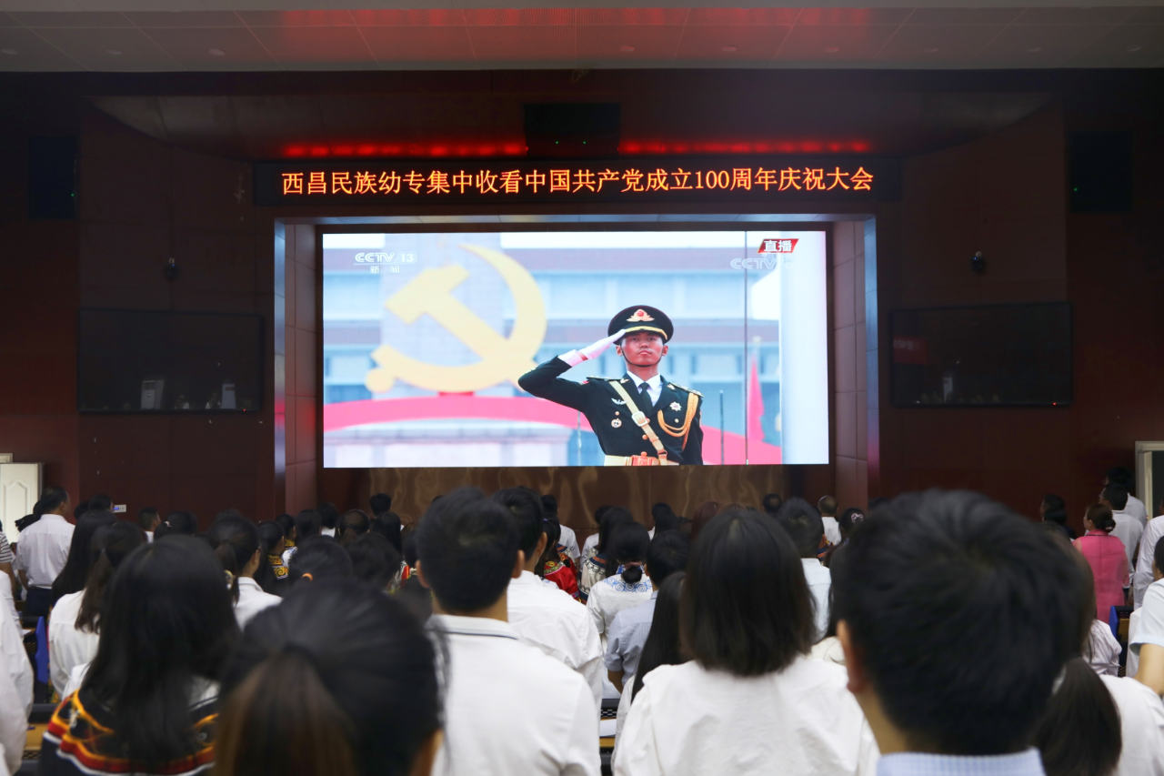7月1日上午8时,西昌民族幼专全体师生齐聚在学术报告B厅、第1教学楼、第3教学楼、第4教学楼、第5教学楼、第6教学楼、第7教学楼,集中收看中国 共产党成立100周年庆祝大会实况直播。庆祝中国 共产党成立100周年,聆听习总书记的重要讲话,回顾中国 共产党百年奋斗的的光辉历程,展望中华民族伟大复兴的光明前程。