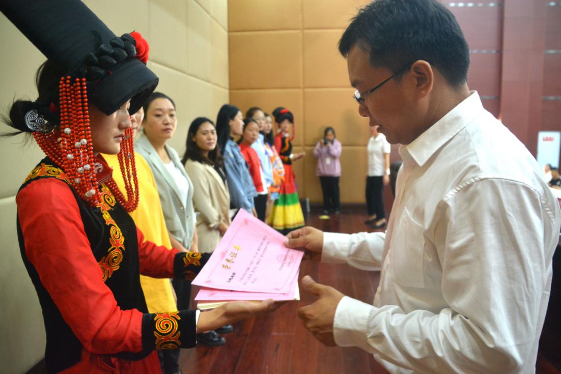 参会领导为优秀学员、优秀班干部、优秀志愿者颁奖,并提倡各位学员要以他们为榜样,不断学习进取,争做一名优秀的幼儿教师。