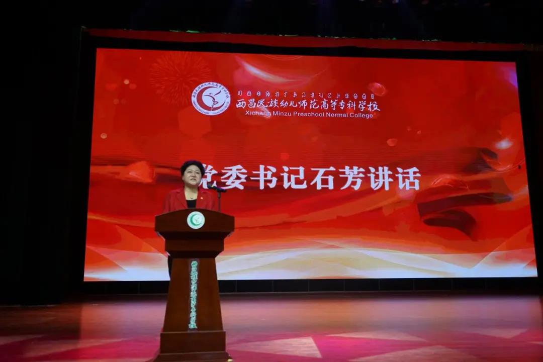 在热烈的掌声中,党委书记石芳总结致辞。石芳首先向毕业生们表示祝贺,向辛勤培育和指导他们的老师表示衷心感谢。她动情地说:同学们,身处这样一个伟大的时代,是你们的幸运,不辜负这个伟大的时代,是你们的责任。一百多年前,李大钊先生写下《青春》一文:“以青春知我,创建青春知家庭,青春知国家,青春知民族,青春知人类,青春知地球,青春知宇宙”。在此毕业之际,我想将这篇《青春》送给你们,作为学校对同学们的期望和祝福。此时此刻,看着你们即将奔赴星辰大海。希望你们牢记“明道、立德、育爱、奉献”校训精神,扛起“请党放心,强国有我”的担当,带着母校的美好祝福,初心不改,怀揣梦想,敢于追梦,为民族地区基础教育、乡村振兴和中华民族伟大复兴贡献力量。以青春之名,潇洒挥毫,努力绘就属于自己的风华人生。