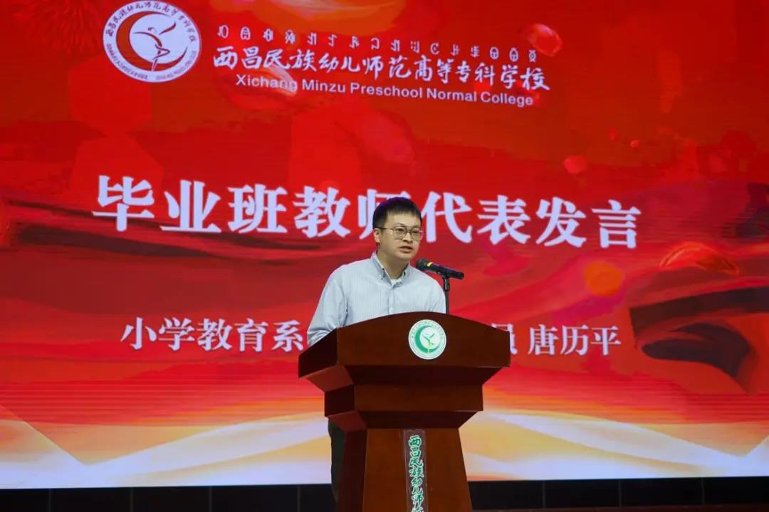 教师代表唐历平为毕业生们送上感人的毕业寄语。在发言中表达了老师们对毕业生的祝福与不舍,希望大家在努力的同时,也不要忘记保持良好的心态去面对未知。肩负师范生的使命牢记明道、立德、育爱、奉献的校训,永远保持对专业的热爱,将知识和能力变为自己成功的阶梯!祝愿同学们在前行路上以梦为马,无愧青春,不负韶华!