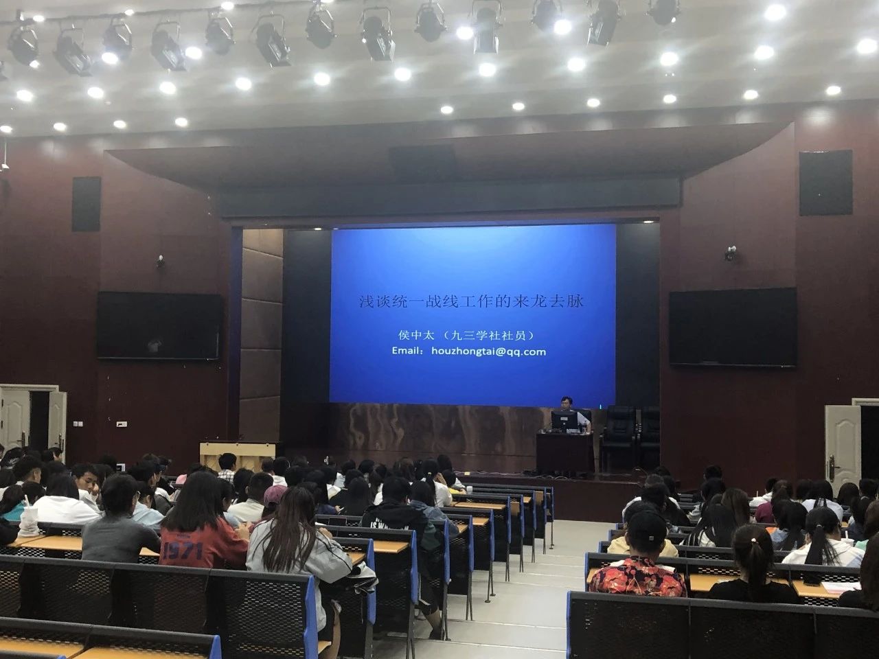 侯中太副校长通过提问的方式展开报告,引发大家对“统一战线”的思考,并对学生的回答进行了点评。他通过对我国“统战”工作历史的讲解,揭示了“统一战线”是中国 共产党取得革命斗争胜利的“法宝”。同时侯校长也指出,现如今我们依然需要继续做好“统战”工作,团结全国力量进行社会主义现代化建设,实现中华民族伟大复兴。