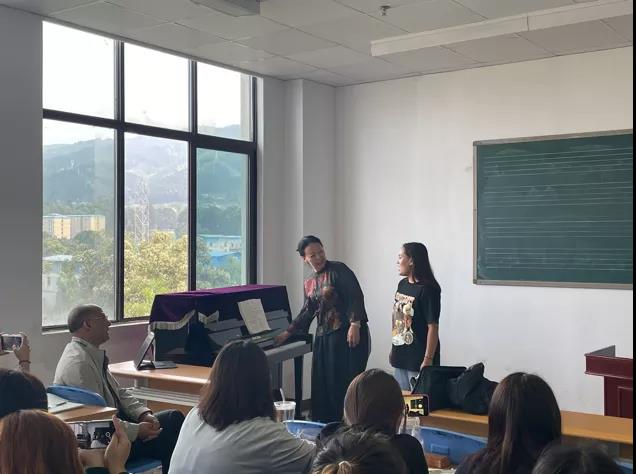 郭敏教授讲课声情并茂、由浅入深、言简意赅。2020级音乐教育专业地的依明同学演唱了歌曲《赶圩归来阿哩哩》,郭敏教授对依明同学进行了一对一的现场点拨,她亲自示范,从正确的呼吸、科学的发声进行指导,增强学生对好声音的辨识能力。