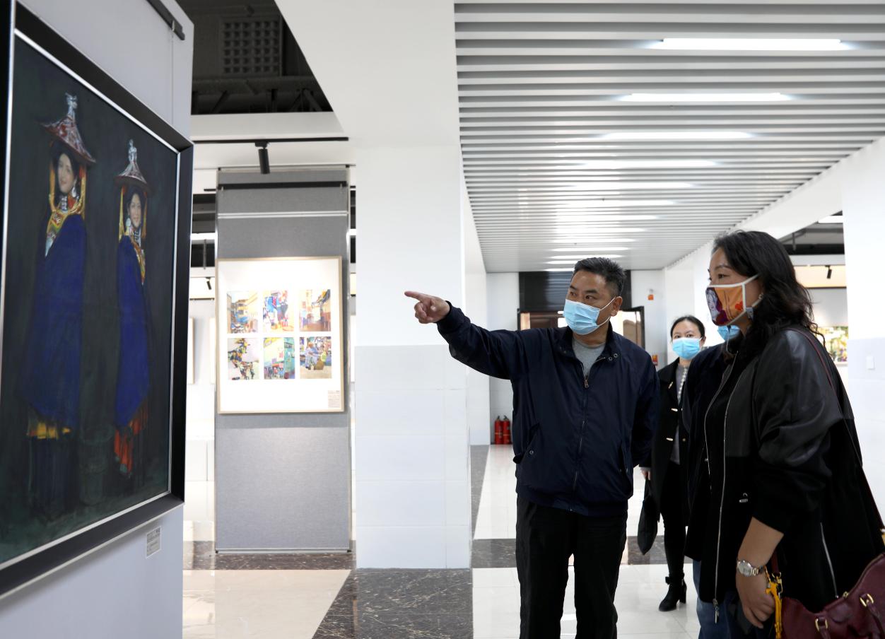 调研组来到美术馆,中国美院帮扶教师高文向调研组一行介绍,馆内作品是中国美院与西幼师生深入昭觉、冕宁、美姑等彝区,重走‘彝海结盟’长征路,开展‘传承红色基因,培育时代新人’的联合课程,进行非遗采风和‘文化还原’联合课程实验教学,结合大凉山丰富独特的文化资源优势,积极探索乡土学院教学育人模式的在地实践,是联合教学采风的创作成果。
