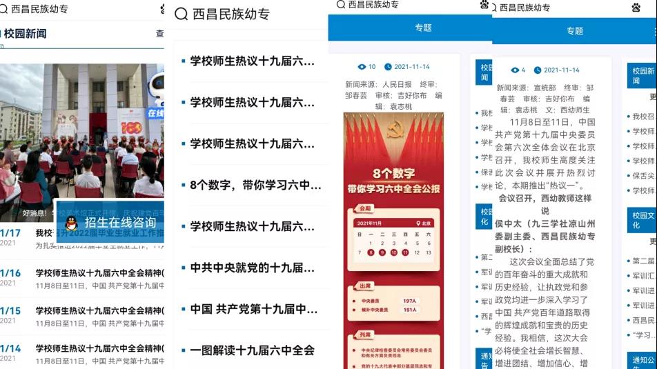 线上线下“两条线”,做到学习宣传到位。线上微信推文已编发4期42名师生体会,官网开设专栏更新文章12篇,制作宣传展板六块,分层次、全覆盖组织开展全会精神“大学习大研讨大培训”活动,党委班子成员一对一深入联系支部抓好学习传达,发挥思政部和思政教师队伍作用,深入开展理论阐释,确保全会精神进教材、进课堂、进师生头脑,做到迅速、广泛、深入,以最短时间营造学校大抓学习宣传的良好氛围。