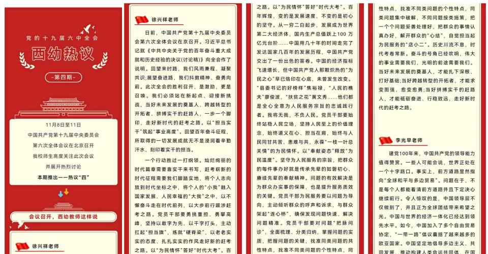 工作结合“两不误”,做到贯彻执行到位。注重学习贯彻全会精神与推动党史学习教育、疫情防控、迎评促建、对标竞进等重点工作结合,走深走实。提前总结年底工作,找短板、补弱项,思考明年工作,做到早谋划、高起点,提振“精气神”、交出“高分卷”、描绘“新蓝图”, 用全会精神凝聚共识、坚定信心、增强斗志,以优异成绩迎接党的二十大胜利召开,以奋进姿态和实际行动回应好习近平总书记发出的号召,办好让人民满意的教育,让教育成果更多更公平惠民族地区人民。