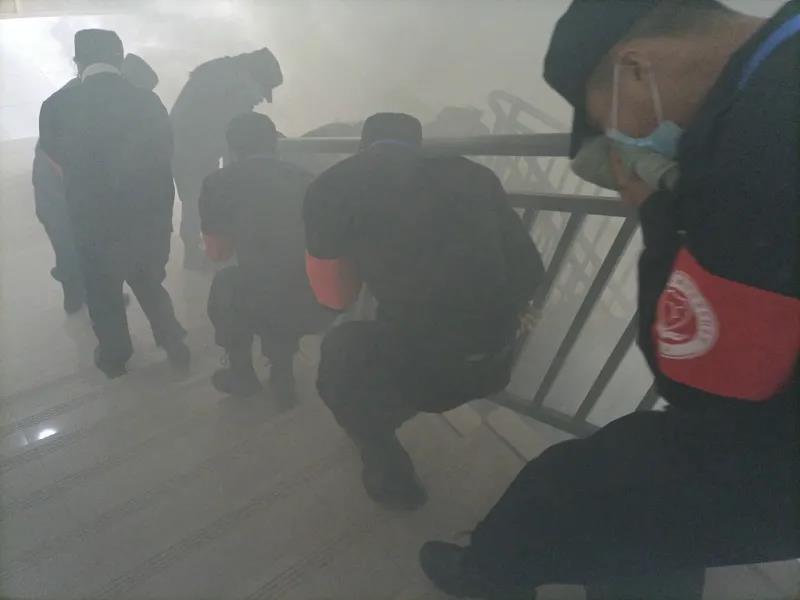 在总指挥侯中太的指令下,火灾警报声响起,工作人员在第四教学楼二楼、三楼、四楼楼梯间点燃烟球,学生及教职工迅速按照消防应急预案要求奔赴各自责任点,开展疏散工作。参演人员用毛巾捂住口鼻、弯腰低身冲出教室,按照消防安全设施指示灯有序疏散。同时,学校微型消防车现场进行灭火作业。5分36秒内,所有人员全部疏散至学校南门外。