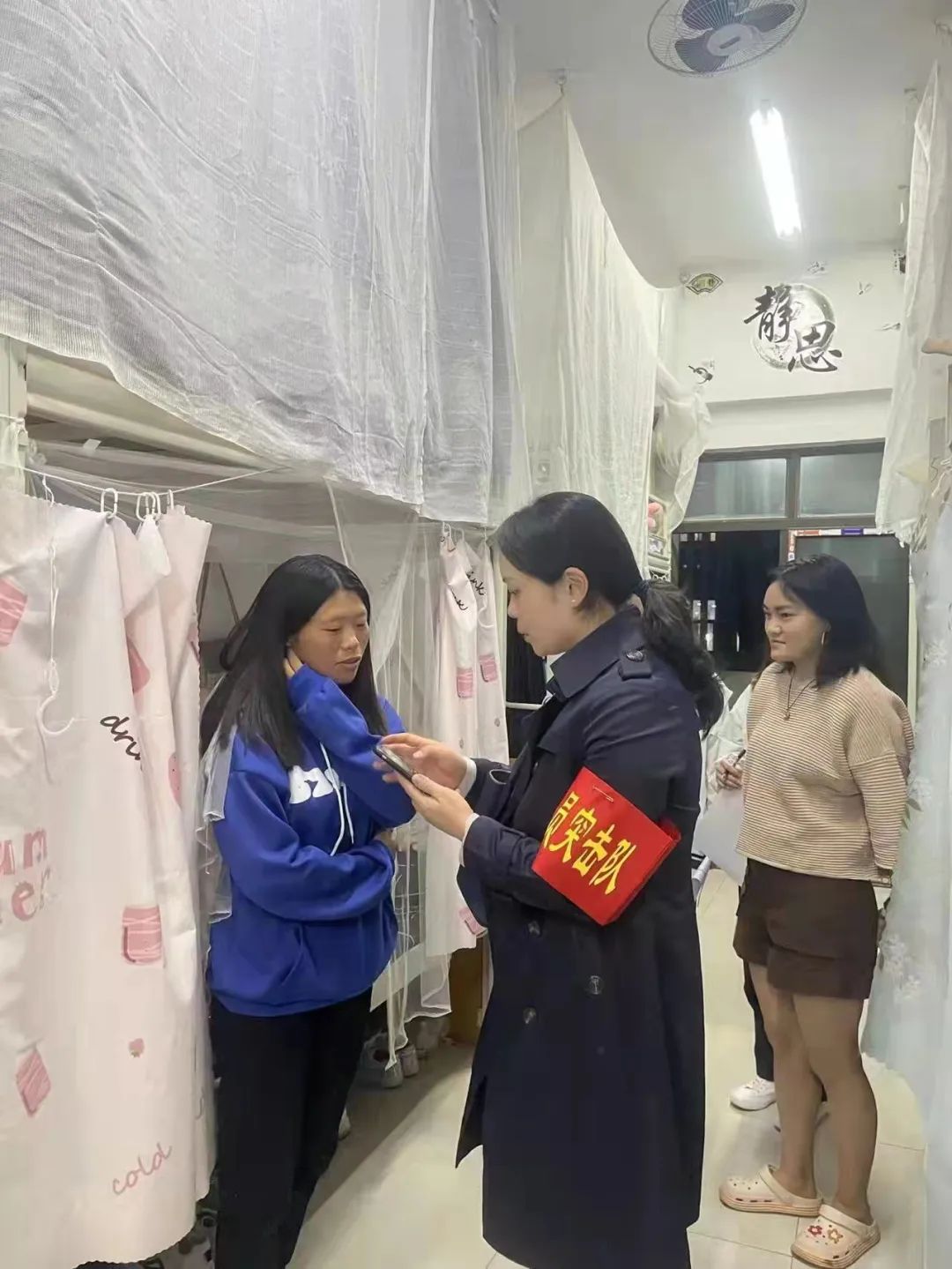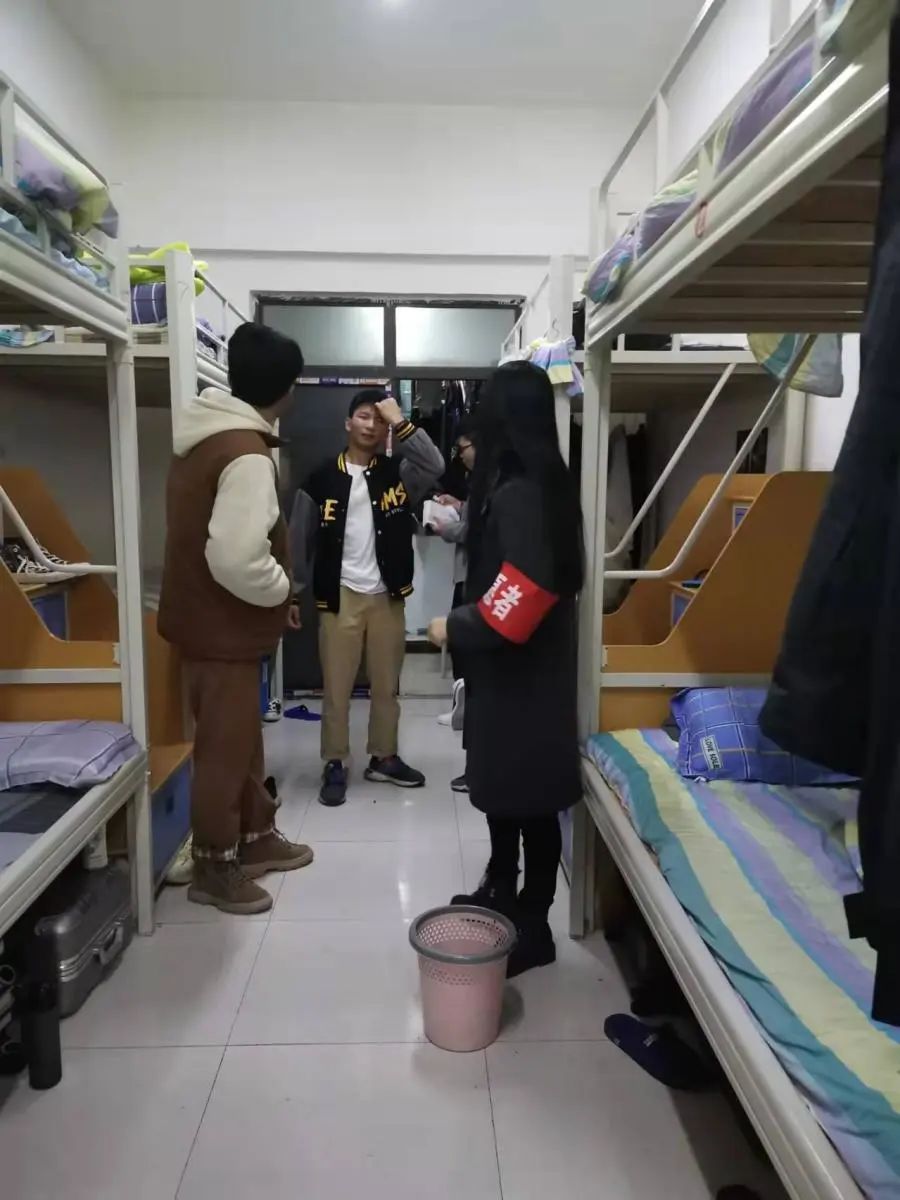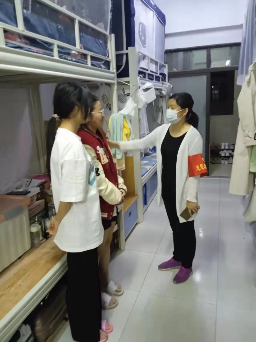 ▲小学教育系党员志愿服务队到寝室检查学生寝室卫生及归寝情况▲