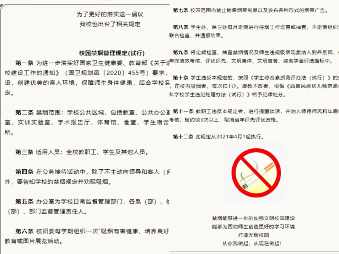 共创无烟环境。学校将建设“无烟校园”作为创建文明校园、文明教室、文明宿舍的重要指标,关心师生身心健康和消除校园安全隐患的重要举措,积极主动开展校园全面控烟活动,全校师生共同携手创建无烟校园,营造健康、和谐的校园环境。