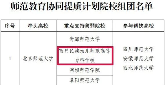 据悉,为深入贯彻落实习近平总书记关于教育的重要论述,落实《中共中央国务院关于全面深化新时代教师队伍建设改革的意见》,推进实施新时代基础教育强师计划,构建高质量师范大学体系,整体提升师范院校和师范办学水平。教育部于2022年2月开始组织实施师范教育协同提质计划,经过学校申报,省级教育行政部门推荐,通过前期调研、形式审查、专家评议等,最终确定了32所重点支持的地方师范院校。西昌民族幼专成功入选师范教育协同提质计划重点支持院校。根据教育部安排,将以“1+M+N”的组团形式,由北京师范大学牵头,四川师范大学、安徽师范大学、西北师范大学参与,共同支持西昌民族师专等4所师范院校建设发展。
