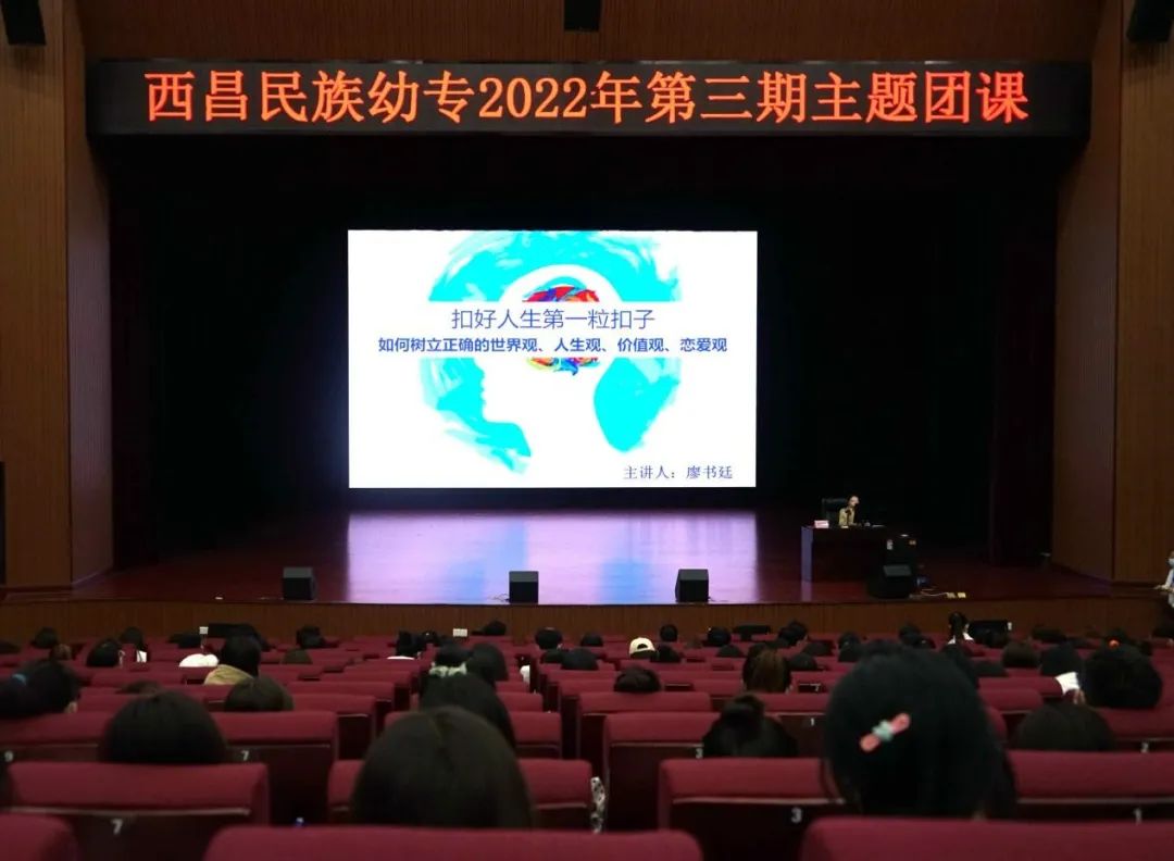 为庆祝中国共青团成立100周年,学习贯彻十九届历次全会精神,加强对团员青年的教育引导工作,营造健康向上的良好氛围。5月17日,西昌民族幼专心理学教师廖书廷以《扣好人生第一例扣子--如何树立正确的世界观、人生观、价值观、恋爱观》为题,在雏鹰剧院为400名师生代表进行了第三期主题团课宣讲。