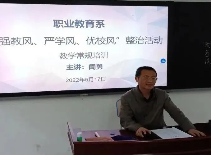 近日,职业教育系邀请迎评促建办公室訚勇教授为系部教师举行教学常规培训。通过培训使“加快转变作风,提高教育教学质量,加强学风建设”活动落到实处。