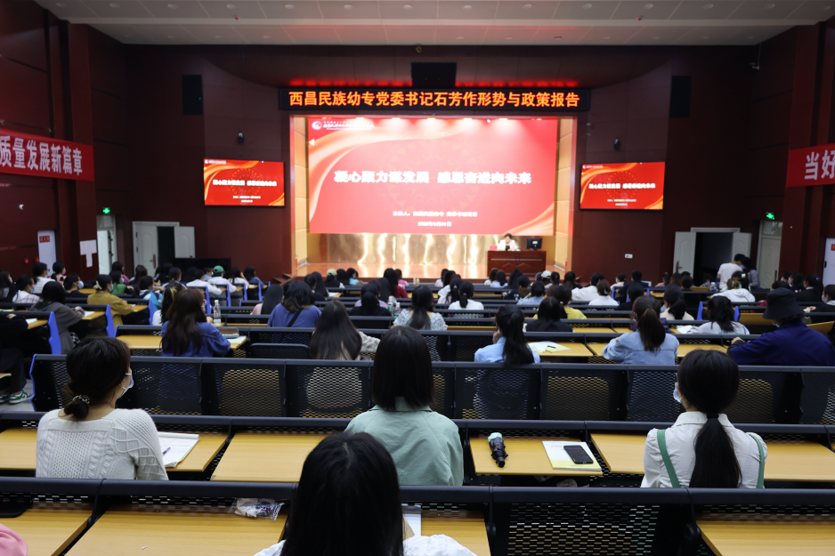 石芳分别从“回顾成果,坚定信心”“把握形势,抓住机遇”“锚定目标,谋划新篇”“不辱使命,勇挑重担”四个方面作了专题报告。她深情回顾了学校创办以来的奋斗历程以及对口支援高校对我校的全力支持和无私帮扶,引导学生更加深入了解学校的过去、现在和未来,激励大家合理定位自己、规划人生。她指出,学校的昨天是顺党中央关于打赢打好精准脱贫攻坚战、彻底攻克深度贫困堡垒重大政治决策之势而生,顺国家大力发展民族地区教育和学前教育之势而生,是贯彻落实习近平总书记到大凉山视察调研重要讲话精神的具体行动。学校的今天已是校园环境不断优化,育人空间不断拓展;发展合力广泛凝聚,人才培养体系逐步完善;育人质量稳步提高,办学成果初显,学校各项事业呈现良好发展态势。同时,学校的发展在党中央、省委省政府和州委州政府相关政策的关怀下呈现诸多有利形势,面临难得机遇。学校的明天是办学定位鲜明,正朝着建“全国民族地区一流、特色鲜明的幼儿师范高等专科学校”的战略目标和创建民族地区本科师范院校的远景目标而努力奋斗。