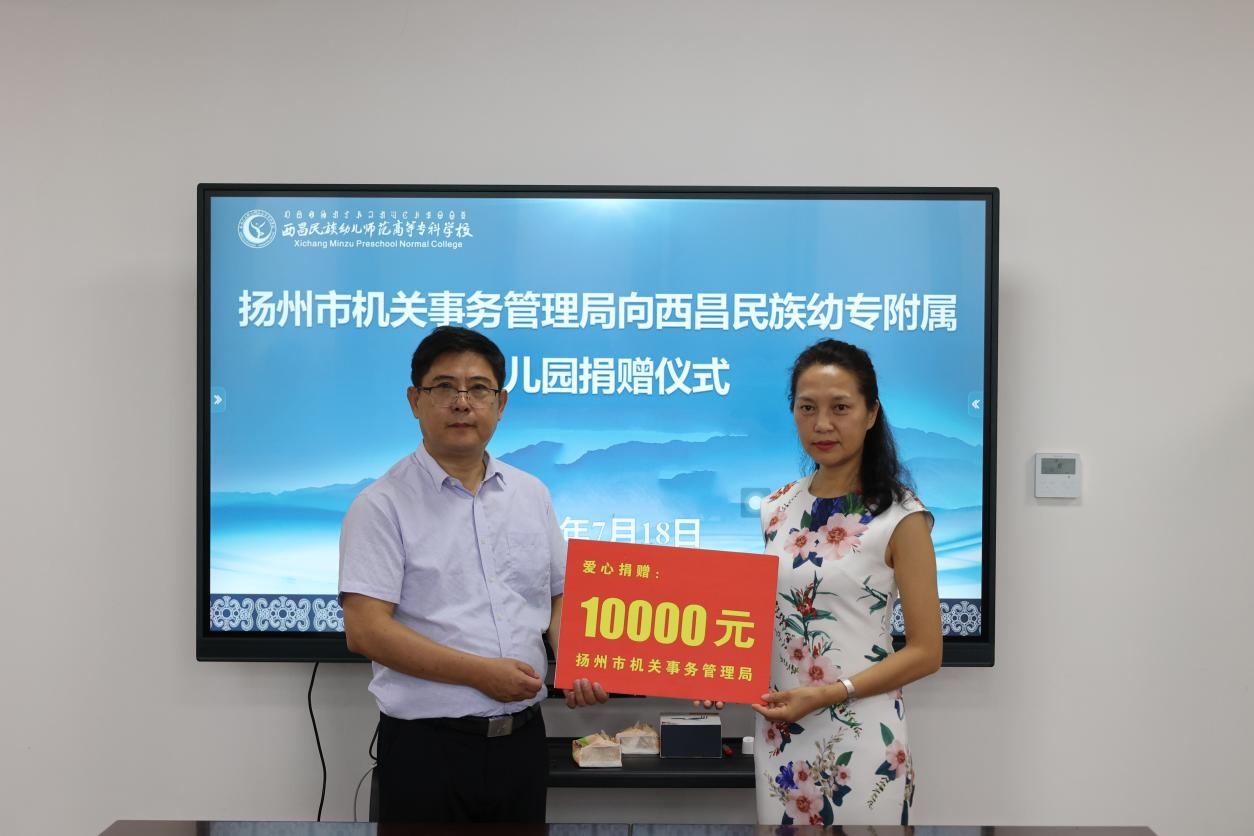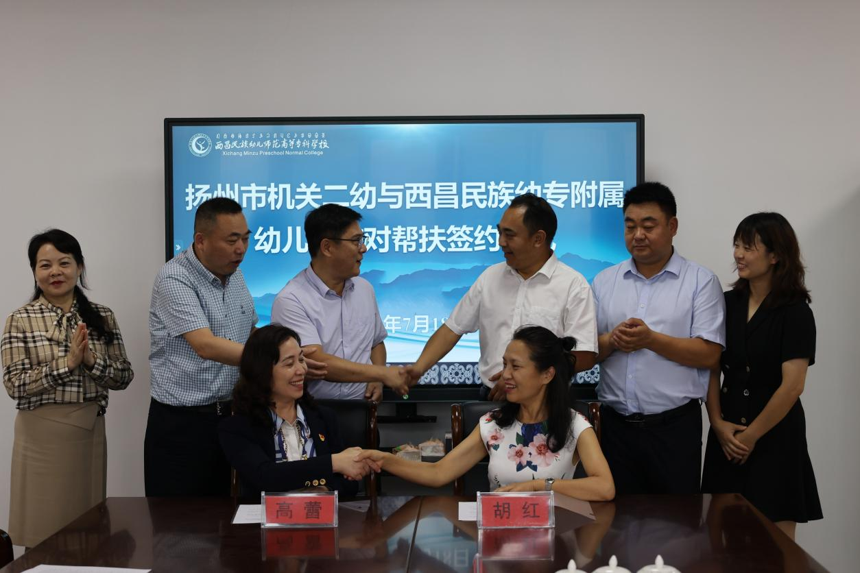会上,西昌民族幼专附属幼儿园执行园长胡红与扬州市机关第二幼儿园主任高蕾签署结对帮扶协议,并接受扬州市机关事务管理局向西昌民族幼专附属幼儿园捐赠的1万元爱心教育帮扶基金。