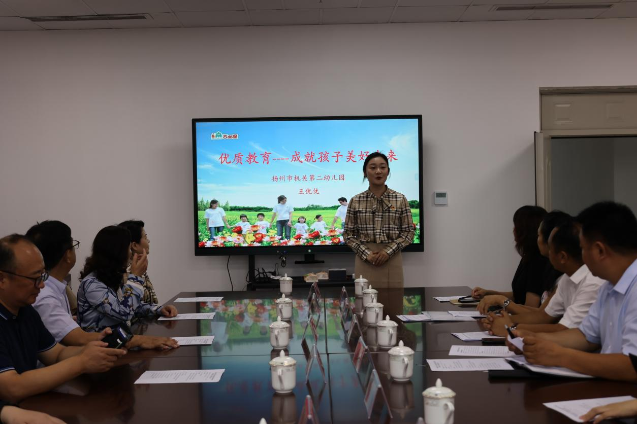 扬州机关第二幼儿园教研组长王优优以“优质教育-——成就孩子美好未来”为主题从扬州市机关二幼的园所文化、队伍建设、党团共建、教学科研、后勤管理等方面向大家进行分享。