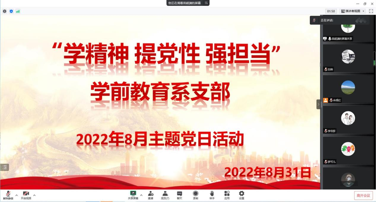 8月31日,学校学前教育系党支部组织全体党员相聚“云端”,在腾讯会议上召开以“学精神 提党性 强担当”为主题的线上党建月会。党委委员、副校长马辉和学前教育系党支部全体党员参加会议,会议由学前教育系党支部组织委员苗超渊同志主持。