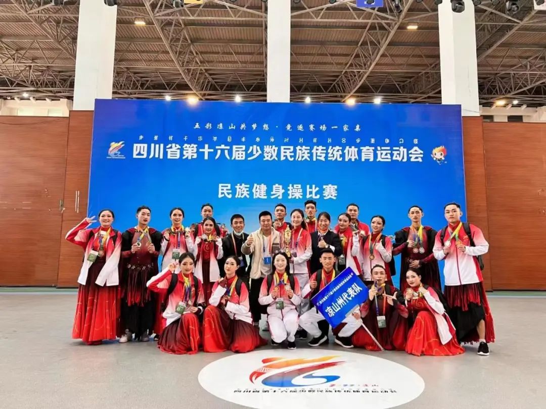民族健身操作为一个新兴项目,第一次被纳入四川省少数民族体育运动会。10月中旬,州教体局决定从我校学前教育系和基础教学部共选拔出18名学生作为运动员代表州队出战本次运动会民族健身操项目,参赛运动员经过近两个月高强度密集训练,在12月3日和4日的比赛中获得《规定套路》组二等奖、《自选套路》三等奖、团体三等奖的佳绩。