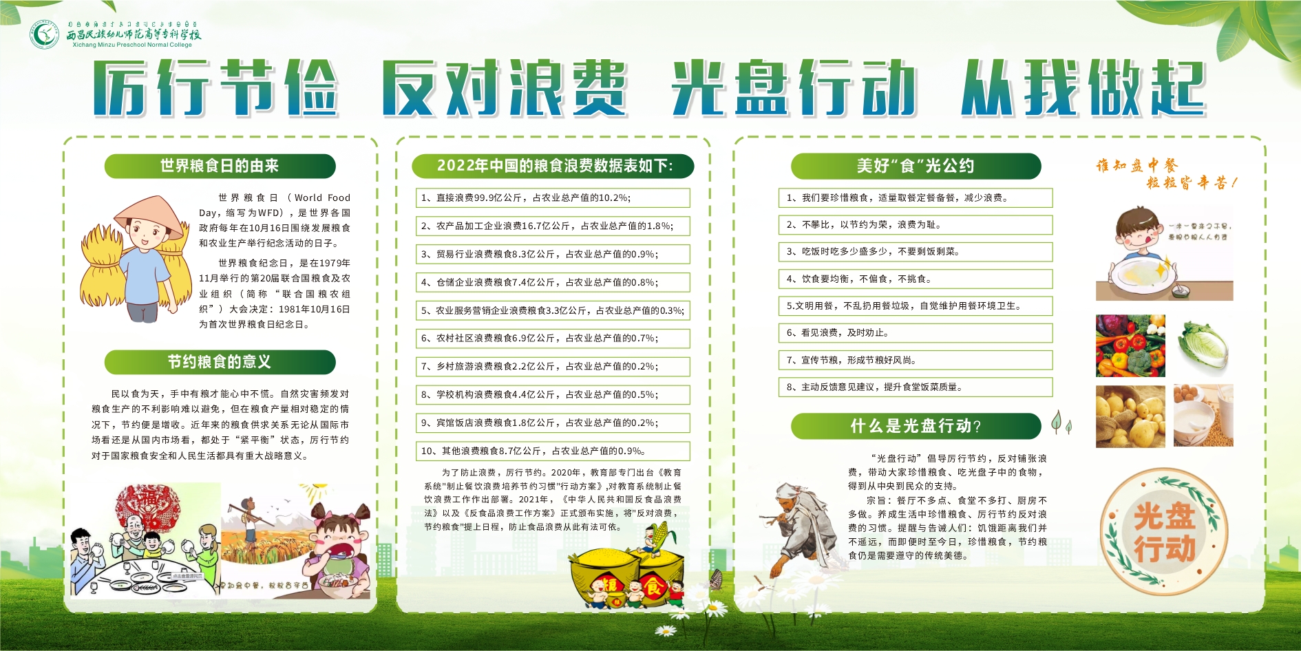为了提升同学们的节粮意识,切实将“节约粮食”落实在行动上,3月20日---24日,学校组织开展了以“节粮不是纸上兵,西幼学子在行动”为主题的节粮宣传系列活动。