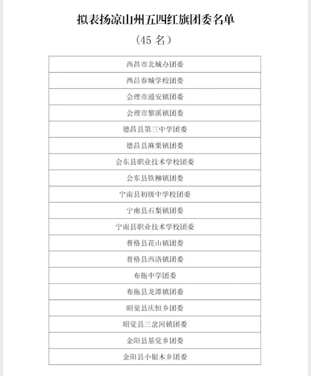按照凉山州“两红两优”评选表扬工作安排,在各县(市)团委、系统团(工)委、州级各行业系统团委推报的基础上,经资格审查、电话调查、征求意见等程序,并经团州委研究,确定拟表扬凉山州五四红旗团委(团支部)、凉山州优秀共青团员、凉山州优秀共青团干部个人(单位)名单,现予以公示。公示期为5月4日至5月9日。