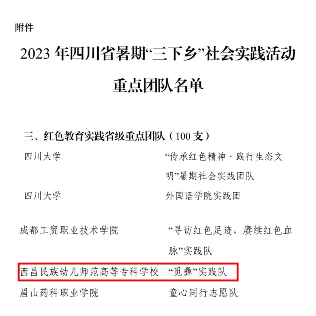 近日,团省委发布了关于公布 2023 年四川省大中专学生志愿者暑期文化科技卫生“三下乡”社会实践活动重点团队名单的通知。我校小学教育系“觅彝”项目实践队成功入选。