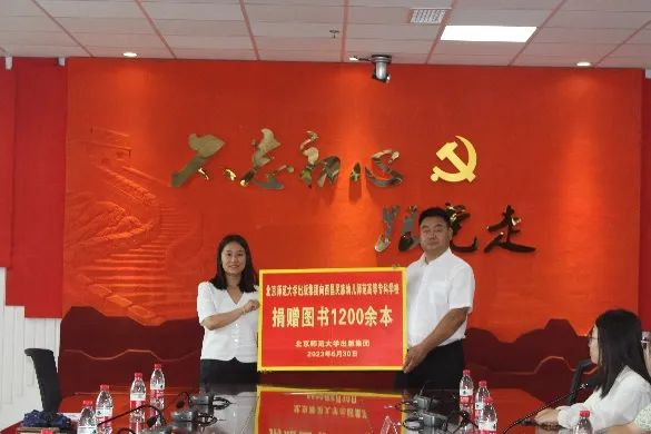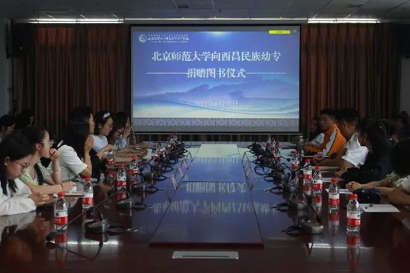 在本次暑期社会实践的总结大会上柴荻代表北师大出版集团介绍向西昌民族幼专捐赠书籍的基本情况,我校余成红代表学校接收捐赠书籍。