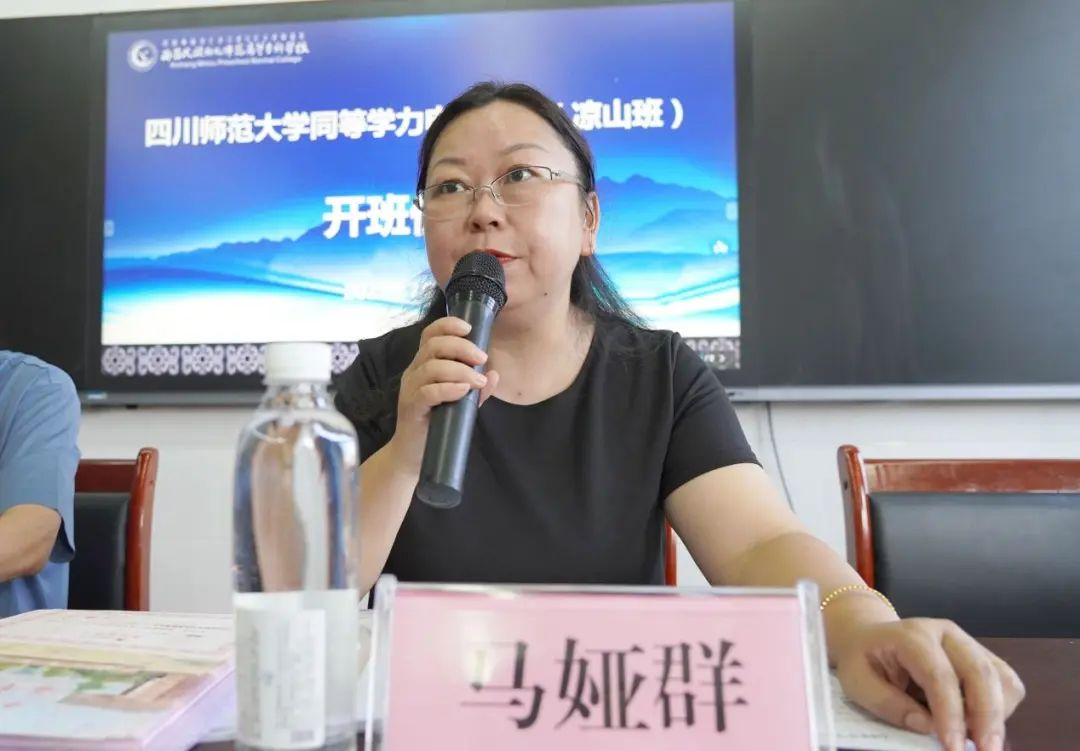 开班仪式上,马娅群回顾了我校设立同等学力申硕凉山教学点以来的招生情况,衷心感谢四川师范大学对西昌民族幼专的帮扶,为凉山的研究生在职教育提供了优质的平台。她指出,该课程为学员们提供了更多发展机会和进修选择,满足学员们进一步深造的需求。希望学员们沉下心来,认真学习、深入思考、积极提问,做到勤学善思、学有所获、学有所成,为民族地区的教育事业作出积极贡献。