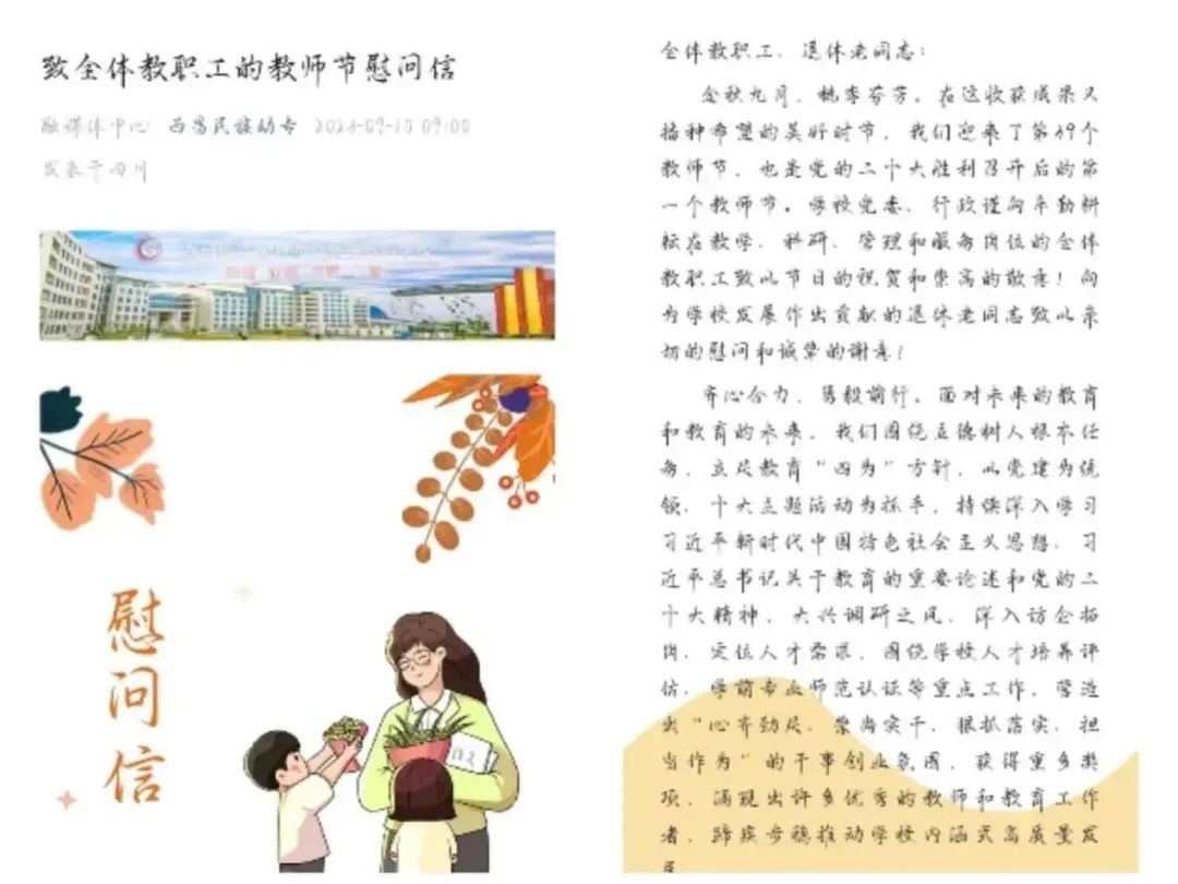 9月10日,学校官网、官微、微信群通过发布一封慰问信,向全体教职工致以最亲切的问候和最诚挚的祝福。