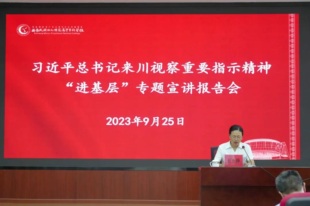 为全面准确、系统深入学习贯彻习近平总书记来川视察重要指示精神,引导广大师生把思想和行动统一到习近平总书记重要指示精神上来。9月25日,州委宣讲第19分队成员、凉山州委党校综合教研室主任,政治学高级讲师姚文兰到我校开展习近平总书记来川视察重要指示精神“进基层”专题宣讲报告会。学校党委中心学习组全体人员,各基层党组织书记、委员,学生代表到场聆听。宣讲报告会由党委副书记、工会主席王玉萍主持。