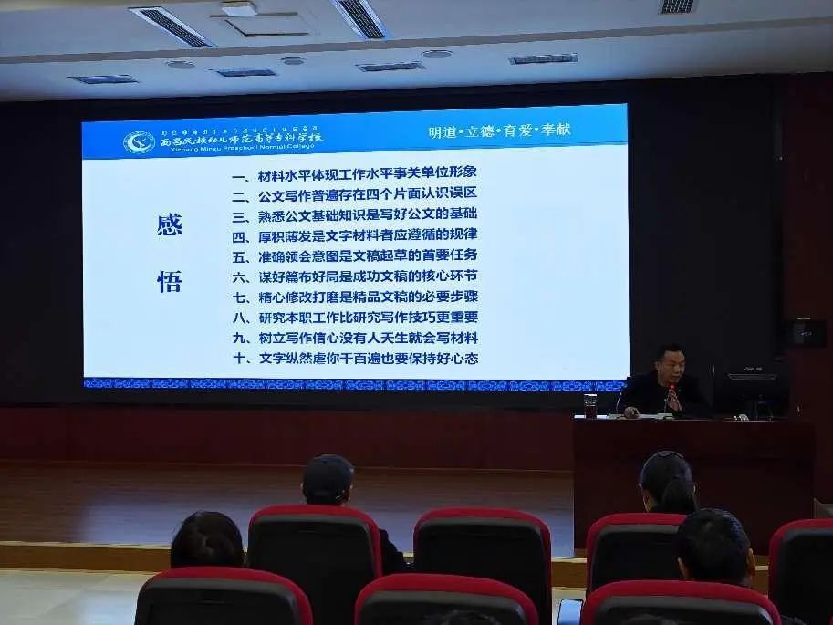 党政办副主任徐兴祥结合自身丰富的公文写作经验,引用身边案例,用诙谐幽默的辞藻、深入浅出的语言,重点从公文写作的价值意义、认识误区、基础知识、遵循规律、首要任务、核心环节、必要步骤、技能技巧、写作信心、写作心态等方面谈了十点感悟,让参训人员既获得了感同身受的共鸣,更获得了受益匪浅的满足。