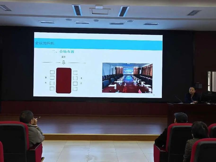 党政办主任王星燃围绕会议组织,重点讲解了会前准备注意事项、不同类型会场布置座牌摆放顺序、公务接待安排和合影站位等知识,进一步提升了参训人员规范办会的能力水平。