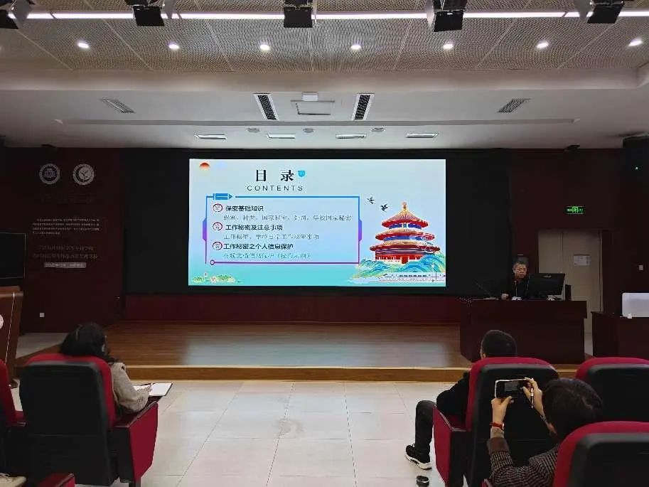 党政办刘先明老师围绕保密基础知识、工作秘密及注意事项和个人信息保护等三个方面,详细地讲解了密级划分、学校涉密事项处置等相关知识,现场演示了在线文档信息保护,进一步增强了参训人员的保密意识,进一步筑牢了学校保密防线。