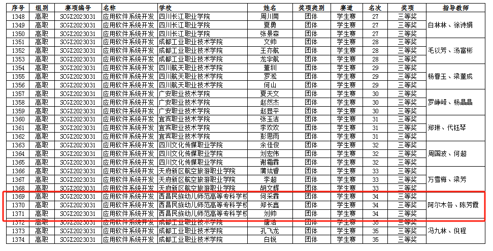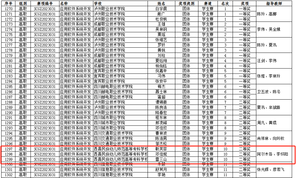 在2023 年“中银杯”四川省职业院校技能大赛(高职组)应用软件系统开发赛项中,我校信息技术系(信息中心)遴选出3支队伍参赛,与来自全省的59支代表队同场竞技。在校领导的关心和各部门的大力支持下,参赛选手在指导教师的悉心指导下,经积极备赛、努力拼搏,由靳芙蓉、邓佳妮、雷三山组成的竞赛团队荣获省二等奖(指导教师阿尔木各,李怀阳),何采霖、郑长鑫、刘帅组成的竞赛团队荣获省三等奖(指导教师陈芳霞、阿尔木各),为学校争得了荣誉。