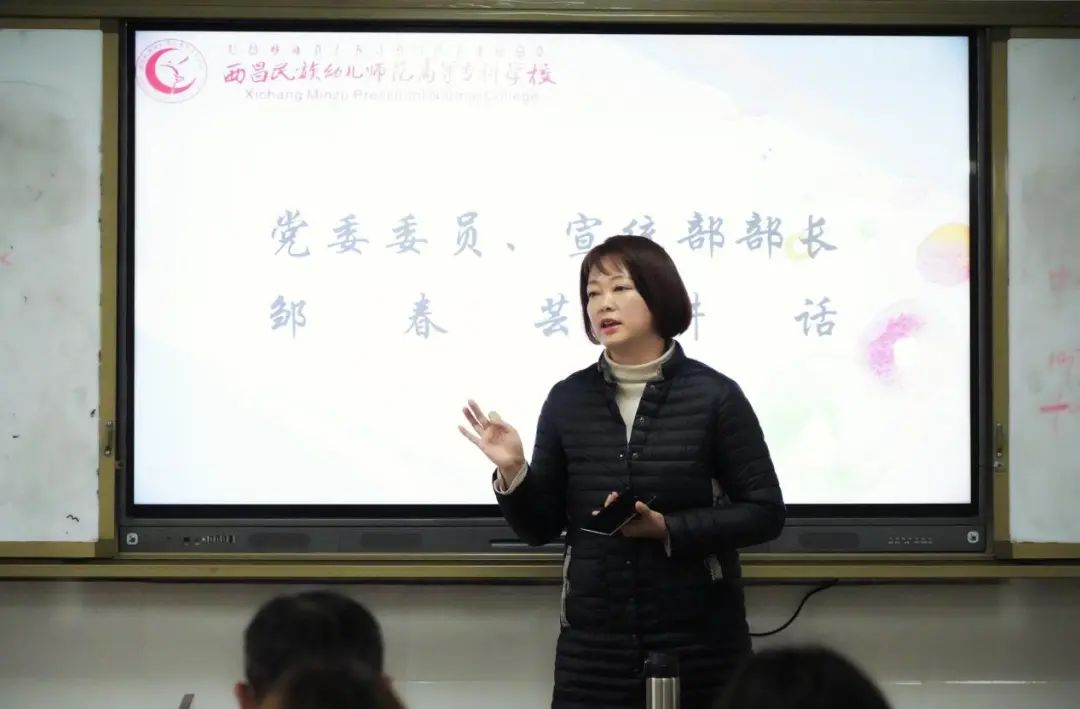 学校党委委员、宣传统战部部长邹春芸对融媒体中心2023年下半年的努力工作和取得的成绩给予了积极肯定,同时分享了《口语表达技巧》的视频来鼓励全体同学要多交流多学习。她表示,融媒体中心是学校重要的学生机构之一,全体同学要以高标准严格要求自己,兼顾学习与工作,珍惜在融媒体中心的时光,充分展示自己的优势与特长。并分享了三句励志古诗词:乘风好去,长空万里——献给奋斗。鼓励同学们不做“45度的人”,要站起来奋斗,以青春之我,奋斗之我,写好自己的历史。将对写、拍、编、播的钟情热爱和兴趣,以实干、实绩谱写成最动人的抒情诗。纸上得来终觉浅,绝知此事要躬行——献给学习。鼓励同学们丢掉书生气,向下接地气,多些烟火气,俯下身子去学习。积极进取,提升自己的学习能力。时人不识凌云木,直待凌云始道高——献给担当。希望同学们要有学习力、发现力、策划力、表达力和传播力,始终保持一颗热爱之心,敢于发现和创新,借助融媒体中心这个平台锻炼自己的表达能力,注重宣传的新颖性,讲好西幼故事,传播西幼好声音。