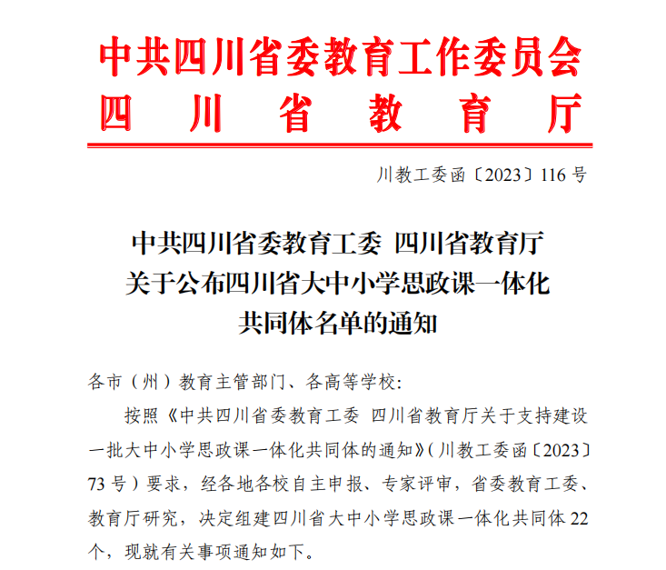 近日,由我校牵头申报的“四川大中小学思政课一体化共同体建设”项目,在学校马克思主义学院周密的策划和精心的准备下,通过了专家团队严格的评审,成为全省大中小学思政课一体化共同体建设项目的牵头高校,全省仅22个。