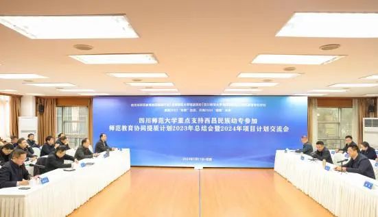 参观结束后,卢立武一行与四川师范大学党委书记郭勇,党委副书记、校长汪明义等四川师范大学的校领导和相关部门负责人开展“四川师范大学——西昌民族幼专师范教育协同提质计划2023年总结大会暨2024年项目计划交流会”。会议以“回首2023‘协同’足迹,共商2024‘提质’未来”为主题。四川师范大学党委副书记张海东主持会议。