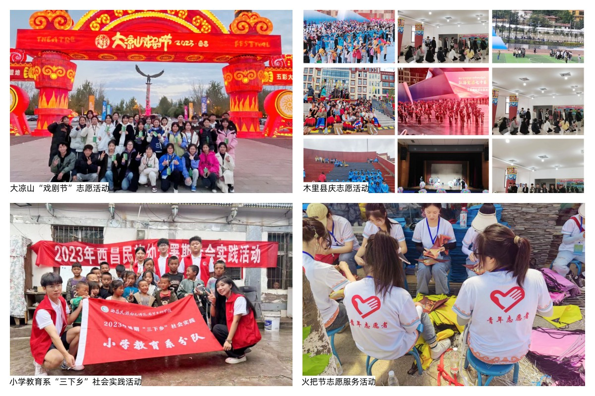 仅2023年,主动承接了地方各类大型活动,志愿服务累计达15000余人次。如,四川省萨马兰奇杯气排球比赛、四川省少数民族艺术节、四川省贡嘎杯篮球赛、凉山州第39届中小学生运动会、凉山州第十届青年创业大赛、凉山州歌舞团艺术基金、大凉山戏剧节、首届大凉山西昌民族电影周、航天卫星发射基地寒暑假讲解实践、凉山文旅航天题材电视剧拍摄、西昌市创文青年、西昌马拉松比赛、木里县县庆等志愿服务,师生们以端庄的举止、专业的知识、热情的服务赢得社会各界的高度认可;开展“学前学普 振兴教育”助力乡村振兴、暑期“三下乡”、社区双报到,包括禁毒防艾宣传、创文宣传、环境整治、慰问空巢老人、助力农特产品电商营销、走进彝绣传承非遗助力乡村振兴等活动,师生充分发挥才智优势,通过“产学研用”一体化直接服务经济社会发展;为了更好地传播党的理论、路线和方针政策,马克思主义学院“初心宣讲团”和青马学社“火把宣讲团”两支宣讲队伍,深入到雷波县、普格县、四川总工会成都工人疗养院等地开展了多次理论宣讲活动,得到了当地群众的高度评价;同时,还牵头成功申报四川省大中小学思政课一体化建设共同体,推动凉山州思政教育一体化建设。