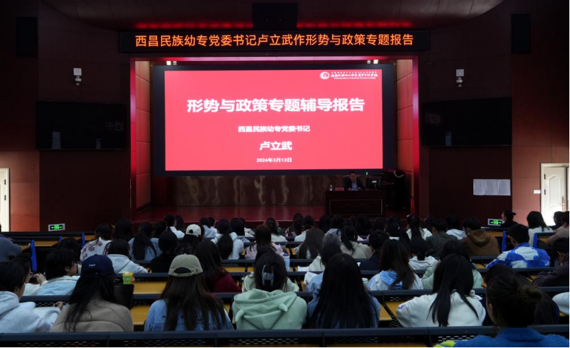 3月13日,党委书记卢立武在学校学术报告A厅为师生讲授形势与政策课。2022级小学教育系部分班级学生和相关科任教师一同听课。