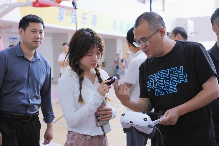 师生们在工作人员的指引下,纷纷戴上VR头显、握着数据反馈手柄在虚拟世界中遨游,使用户能够身临其境地体验各种场景,大家对这次新奇的体验赞不绝口。