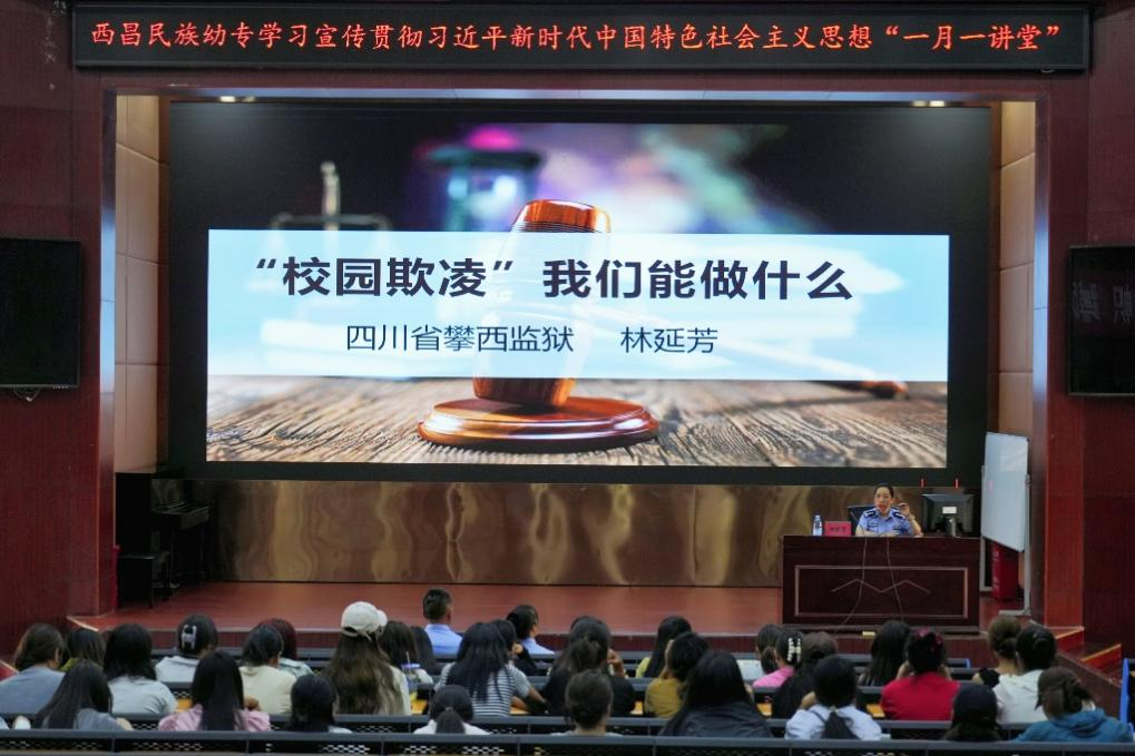 为加强对青年大学生的法治教育,提升大学生的法治素养,5月28日,我校特邀四川省攀西监狱一级警长林延芳到校开展以防范校园欺凌为主题的专题讲座。学校各系部共270余名学生参加了本次讲座。